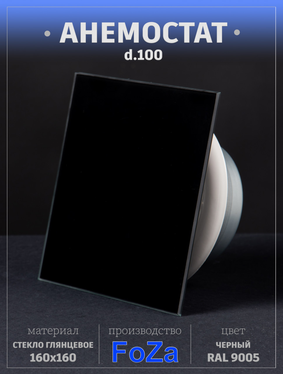 Анемостат со стеклянной внешней частью FOZA D 100 мм. Глянцевое стекло 160х160 мм. Цвет Чёрный. RAL 9005. Квадрат в интернет-магазине «ВЕНТФОМ». Заказать с доставкой! Тел.: +7 (925) 201-33-89.