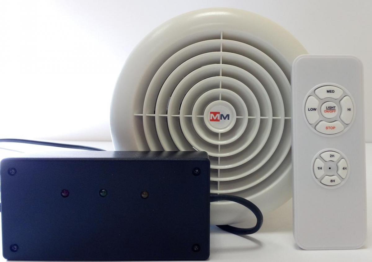 TkV-05 RF "Арктика" приточная с подогоревателем. Беспроводный пульт ДУ (радиоканал 433 МГц). 3 скорости, 30/70/150 м³/ч, 1200 Вт (эл. Калорифер) + 46 Вт (вентилятор), встроенный термостат (менее +16ºС- вкл., более +23ºС- выкл.), обратный клапан, фильтр (угольный + G4). Минимальная толщина стены 270 мм, Ø 170 мм . Внутренняя решётка — круглая, белая