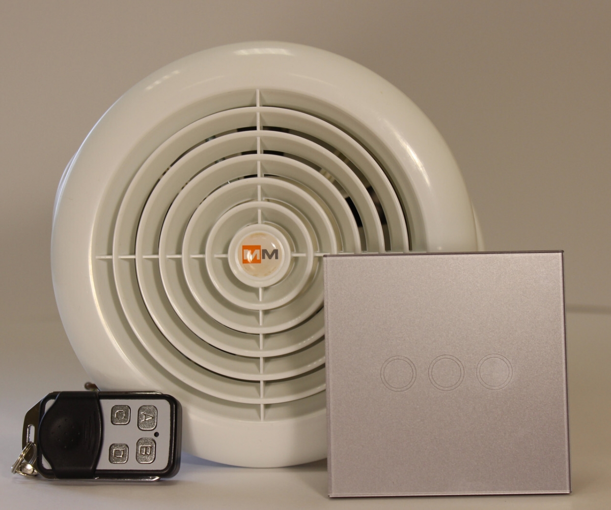 TkV-05 RF-SW "Арктика" приточная с подогоревателем. Беспроводный пульт ДУ (радиоканал 433 МГц) в комбинации с настенным сенсорным переключателем, управление по Wi-Fi, 3 скорости, 50/100/150 м³/ч, 1200 Вт (эл. Калорифер) + 20 Вт (вентилятор), встроенный термостат (менее +16ºС- вкл., более +29ºС- выкл.), обратный клапан, фильтр (угольный + G4). Минимальная толщина стены 270 мм, Ø 170 мм . Внутренняя решётка — круглая, белая