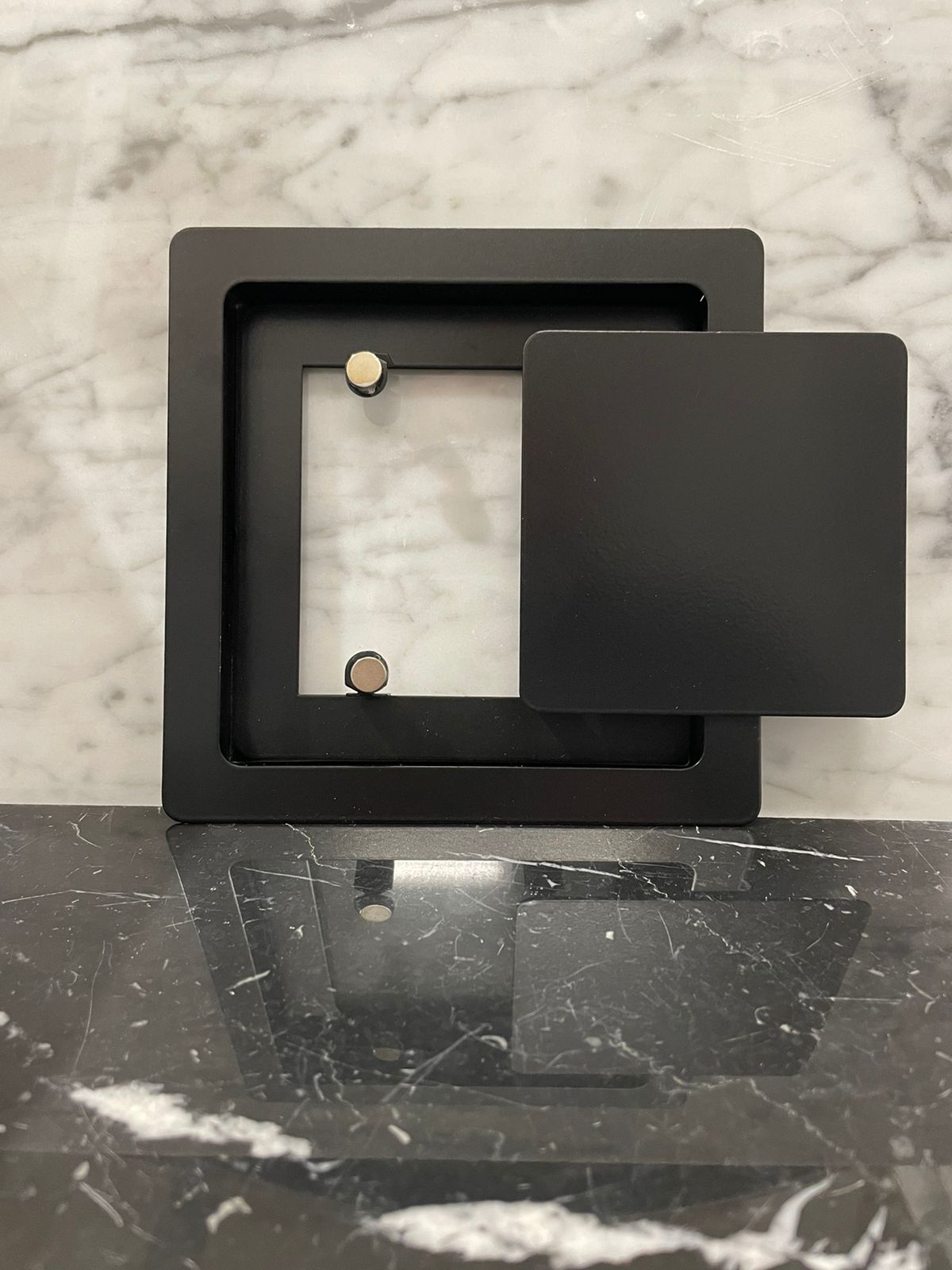 Рамка прикрепляется к стене или полотку при помощи саморезов или клея, а верхняя часть с глухой панелью фиксируется к рамке при помощи неодимовых магнитов.