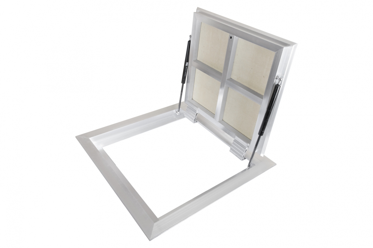 Напольный люк для ревизии, незаполняемый, с амортизаторами и фиксирующими элементами.