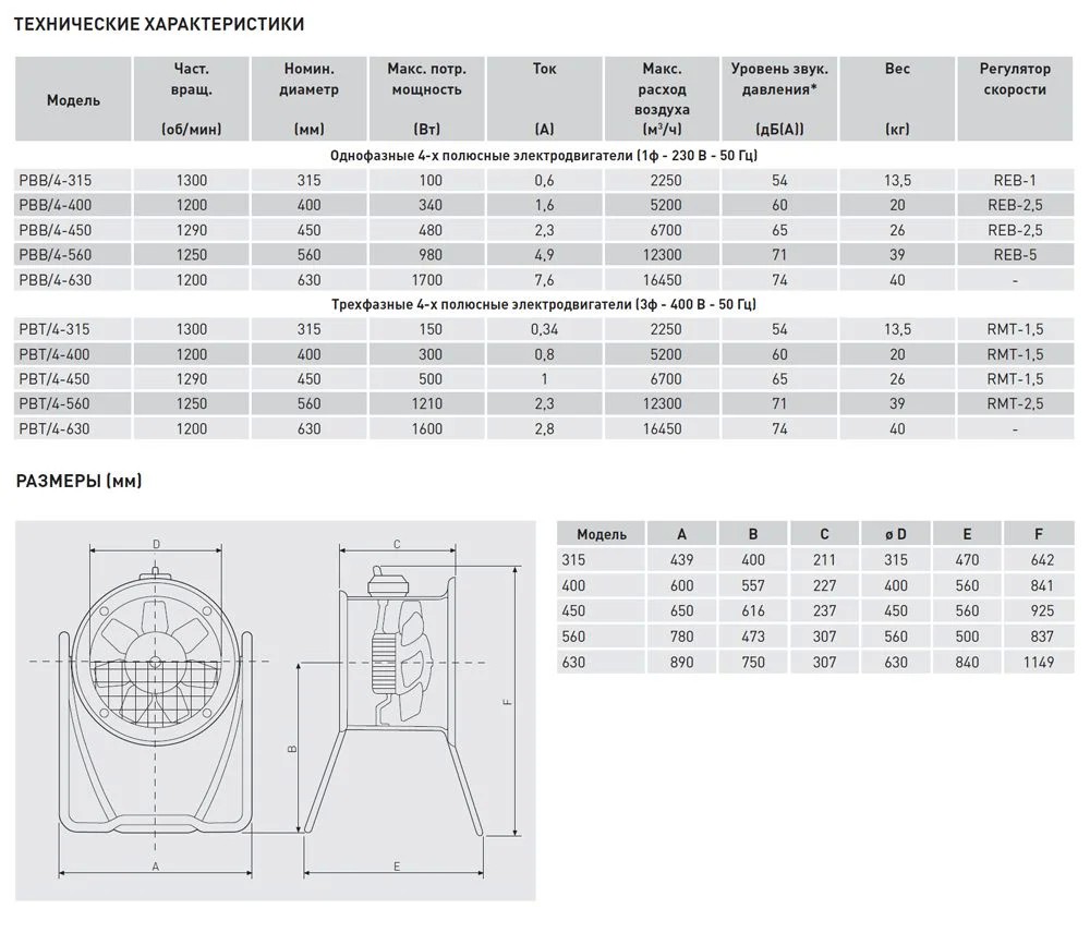 Однофазные вентиляторы имеют возможность регулирования скорости при помощи напряжения, а трехфазные при помощи автотрансформаторов и преобразователей частоты (за исключением модели 4/630).