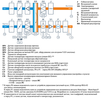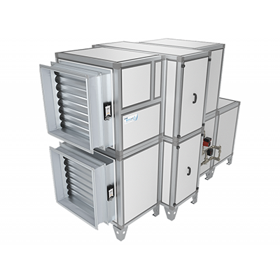 • Приточно-вытяжная установка с роторным рекуператором, фреоновым охладителем, водяным нагревателем и смесительным узлом с 2-х или 3-х ходовым клапаном (узел подбирается исходя из типа водоснабжения).