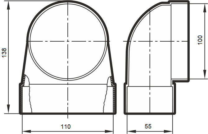 Соединитель угловой 90 градусов плоских воздуховодов 110х55 с круглыми диаметром 100 мм