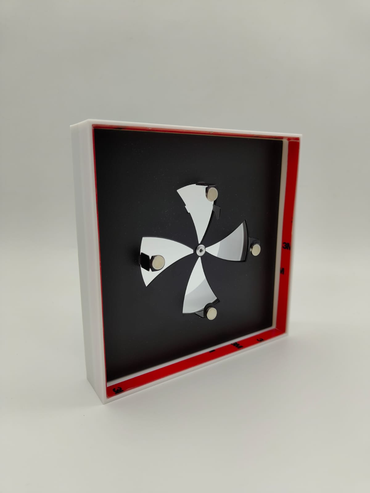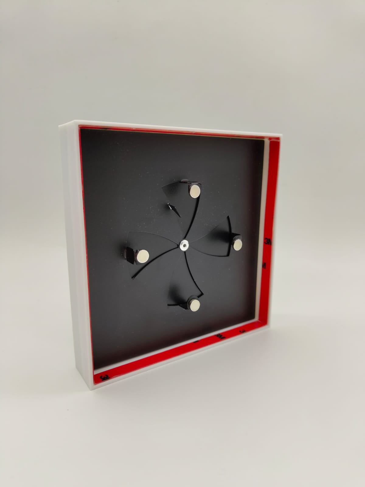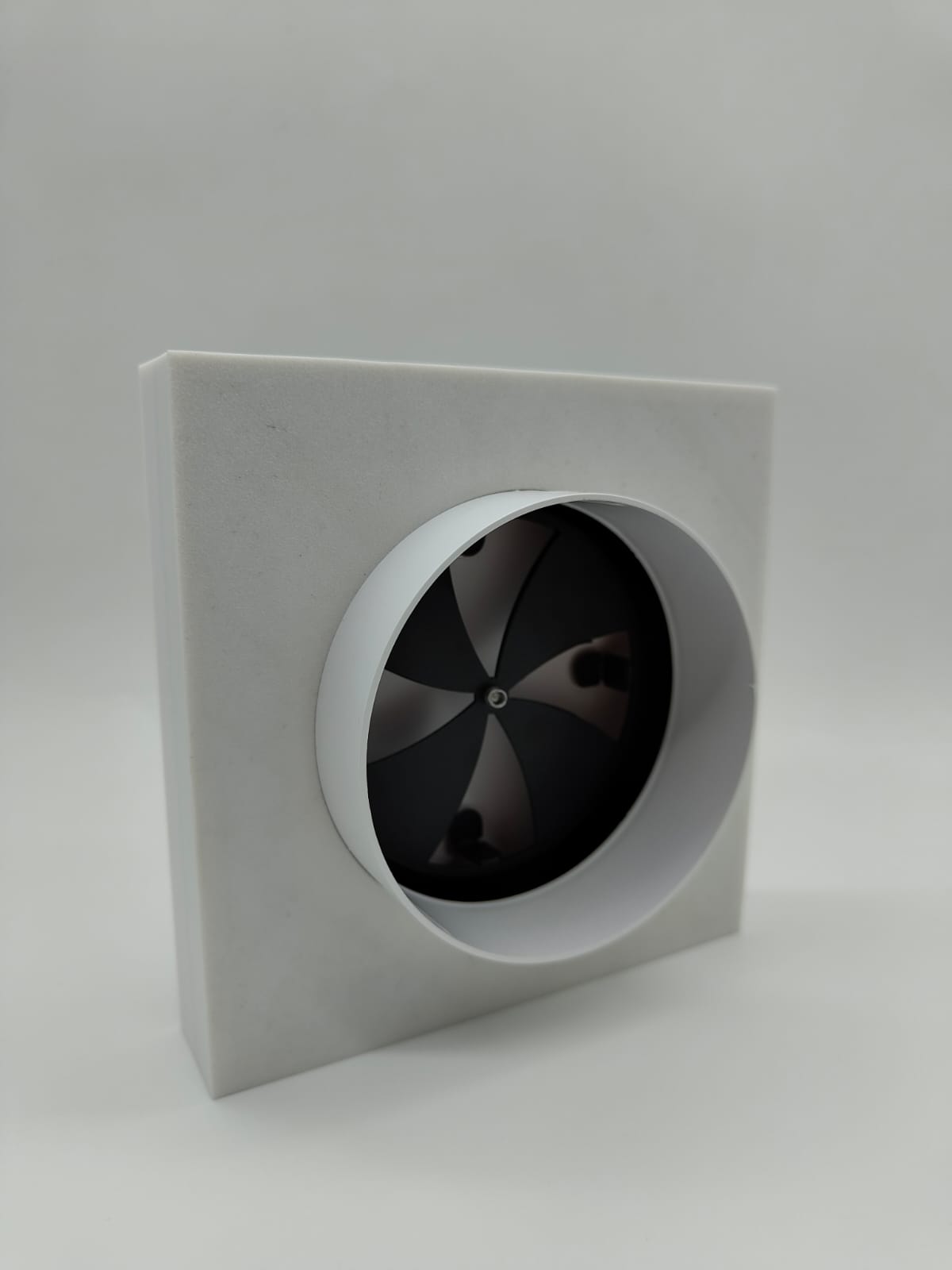 Диффузор состоит из пластикового перехода, металлической заслонкой, которой можно регулировать поток воздуха, либо полностью перекрыть его. К заслонке с помощью магнитов крепится декоративная квадратная панелька, которую можно покрасить в цвет потолка. Так же по ободку диффузора имеется надёжный двухсторонний скот марки 3М, к которому крепится полотно натяжного потолка.